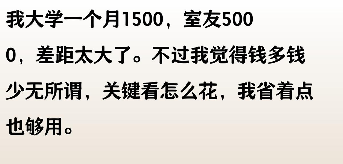 我一個月生活費800,室友都是2000起步。他們天天點外賣喝奶茶,我只能吃食堂最便宜的菜。有次他們聚餐叫我,我找借口沒去,其實是因為兜里只剩50塊要撐到月底。最難受的是他們討論新款手機和球鞋的時候,我連插話的資格都沒有。