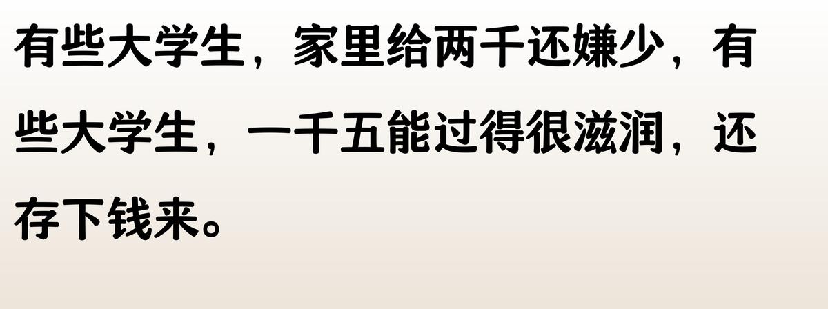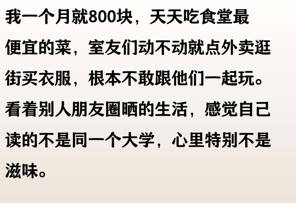 我家一個月給800,食堂吃最便宜的,衣服穿高中校服。室友天天點外賣買AJ,還笑話我土。最難受的是有次班級聚餐AA,我掏不出錢只能找借口溜走。現在兼職三份工,就為了能體面點畢業。