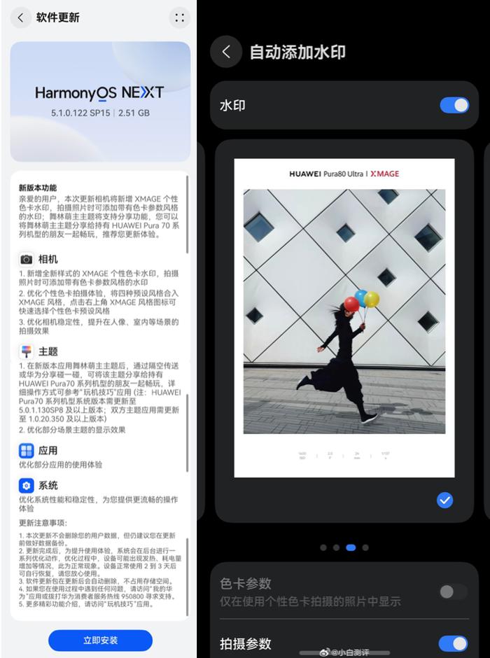 另外隨著上市,今日華為Pura 80 Ultra還OTA了新版本,新增XMAGE個性色卡水印,優化相機穩定性等等。相關用戶可以看下~