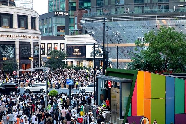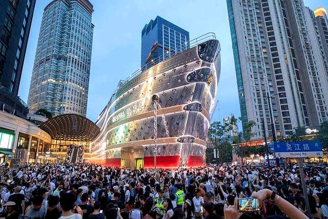 LV"路易號"巨輪直接把南京西路變成外灘既視感 13號線南京西路站11號口現在只進不出 現場人從眾叕到自動扶梯都在循環播放安全提示 見過追星的沒見過追船的 穿LV衫的爺叔背LV包的阿姨抱娃的家長 硬是把奢侈品展搞成了全家總動員