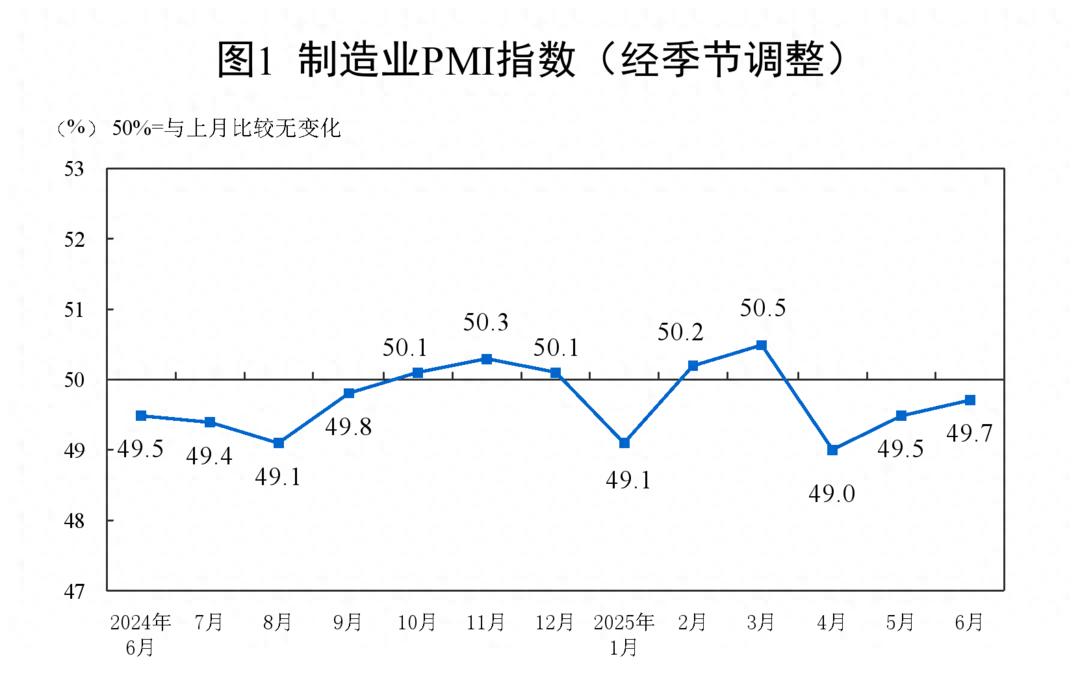 6月30日,國家統計局發布2025年6月制造業采購經理指數、非制造業商務活動指數、綜合PMI產出指數。其中,制造業采購經理指數(PMI)為49.7%,比上月上升0.2個百分點,仍處于收縮區間。非制造業商務活動指數為50.5%,比上月上升0.2個百分點;綜合PMI產出指數為50.7%,比上月上升0.3個百分點,均高于臨界點。
