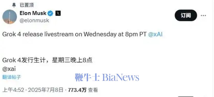 馬斯克今日發帖,宣布xAI新一代Grok 4大模型將于太平洋時間周三晚8點,即北京時間周四上午11點發布,屆時將在X上進行直播。