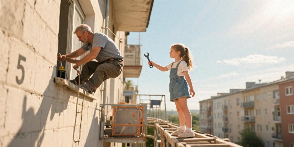 那天午后,濟南的街頭熱浪滾滾,陽光像火焰似的炙烤著大地。在某小區5樓的外墻作業平臺上,一位女孩正踮起腳尖,把扳手遞給懸空作業的父親,她的T恤后背早已經被汗水浸透啦!那一刻,仿佛時間都凝固了,這畫面深深印在了每一個看到它的人心里。