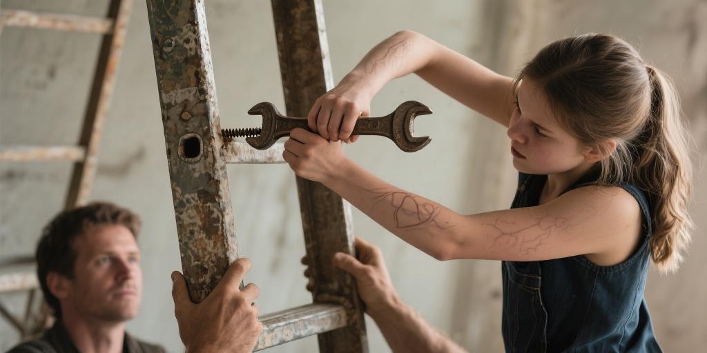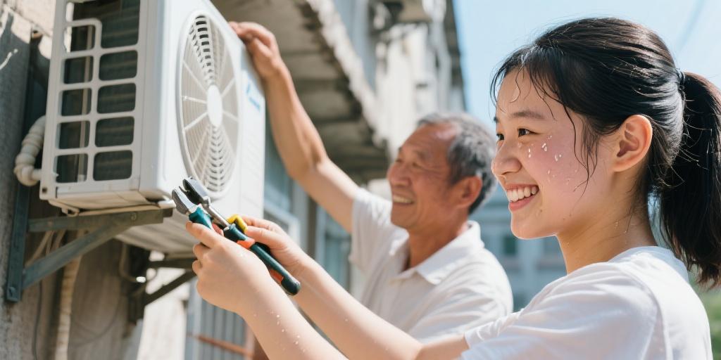 有一次,舊扳手卡在銹死的螺絲上,她咬牙用力,手臂青筋微現。那股韌勁就跟她啃下數學最后一道壓軸題時的專注神情一樣。悶熱的室內,她書架上密密排列的習題冊與褪色的獎狀,默默見證著每個深夜伏案的背影。父親用布滿老繭的手撐起她讀書的燈,如今女兒以這沉默的汗水回應。她托舉的何止是笨重的鐵殼呀?那是父親被歲月壓彎的脊梁,是他長年累月奔波勞碌后無聲的疲憊。父親在下面托穩梯子,仿佛托舉著女兒的未來;女兒在上面穩住外機,仿佛托舉著父親的辛勞。