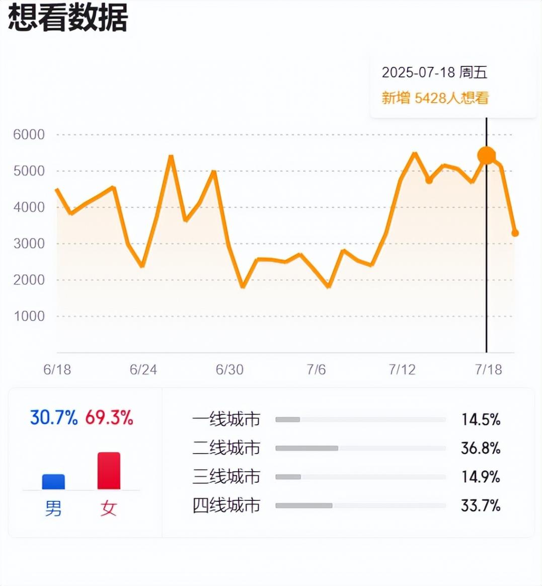其中,二線城市、四線城市觀影人數居多,分別為36.8%、33.7%,女性觀眾占比69.3%,男性觀眾僅占30.7%。