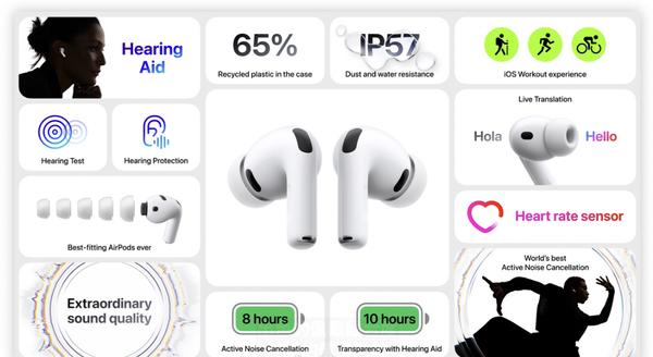 健康功能也迎來拓展,AirPods Pro 3內置心率傳感器,支持50種運動項目的心率監測,并可在運動過程中提供實時語音激勵。此外,新耳機支持IP57級別防水防塵,適應更多使用場景。
