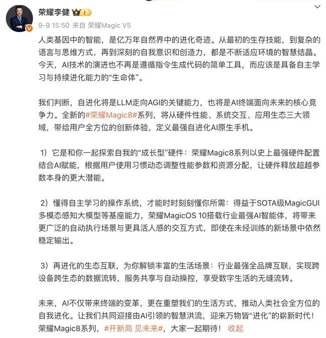榮耀CEO李健此前表示,榮耀Magic8系列通過AI賦能硬件與軟件的深度結合,讓AI以“原生”方式重構產(chǎn)品價值。榮耀智能體YOYO更像一位個性化助理,隨著用戶的使用不斷迭代,越來越懂用戶的需求。這種自進化能力,使得榮耀Magic8系列不僅僅是一部手機,更是一位能夠不斷學習、不斷進步的智慧伙伴。