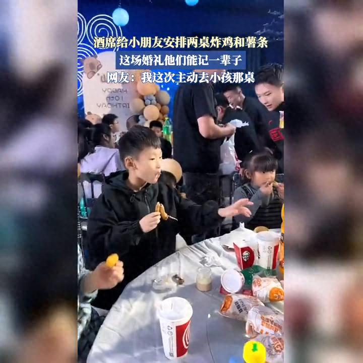 酒席給小朋友安排兩桌炸雞和薯?xiàng)l。網(wǎng)友:我這次主動(dòng)去小孩那桌。