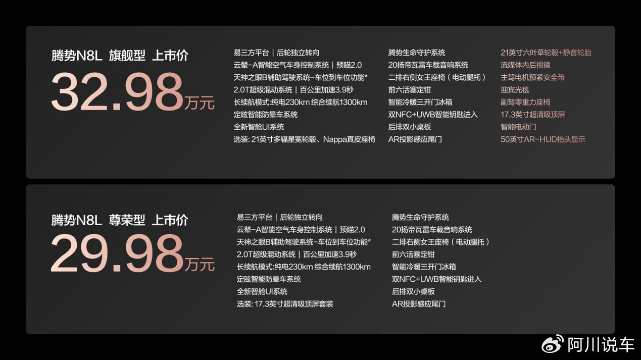騰勢總經(jīng)理李慧的一番話是相當(dāng)?shù)淖孕牛猜冻隽诵萝嚨膶嵙?dān)當(dāng)!新車售價29.98萬元起,在各種優(yōu)惠政策下,新車權(quán)益價值至高10.67萬元!騰勢N8L在售價方面也是誠意滿滿!