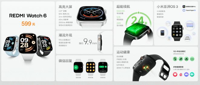 支持心率、血氧、睡眠、壓力、女性健康管理,內置呼吸訓練功能,結合專業指導與細膩振感,助力身心放松。支持150+運動模式,5ATM防水,GNSS獨立定位,雙L1天線精準導航,全面滿足運動與日常使用需求;REDMI Watch 6售價599元。