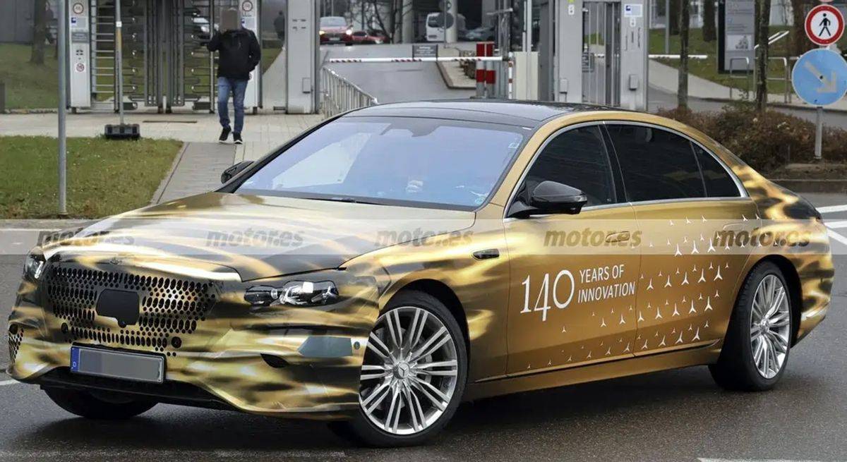 從諜照來看,盡管新車車身覆蓋著黃黑色相間的偽裝貼紙,但部分細節已清晰可見。側面輪廓基本延續現款設計,不過測試車前門印有“140 years of innovation”(創新140年)字樣,前翼子板處新增攝像頭,推測將搭載最新的智能駕駛輔助系統。車尾部分,尾燈經過重新設計,融入“三叉星”元素,辨識度大幅提升。