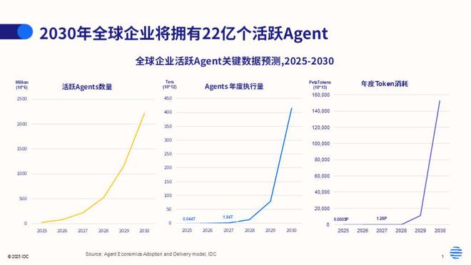 APP獲悉,IDC預計,活躍Agent的數量將從2025年的約2860萬,快速攀升至2030年的22.16億。這意味著五年后,能夠幫助企業執行任務的數字勞動力數量將是今天的近80倍,年復合增長率139%,換言之,平均每年活躍Agent數量都將以超過一倍的速度增長。